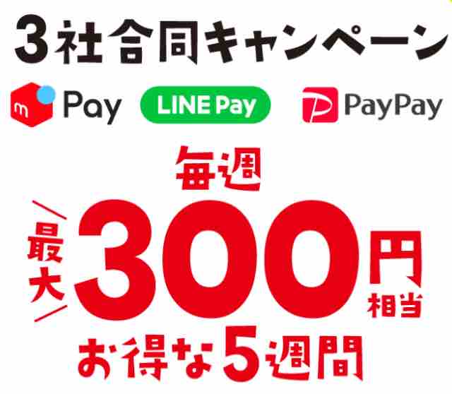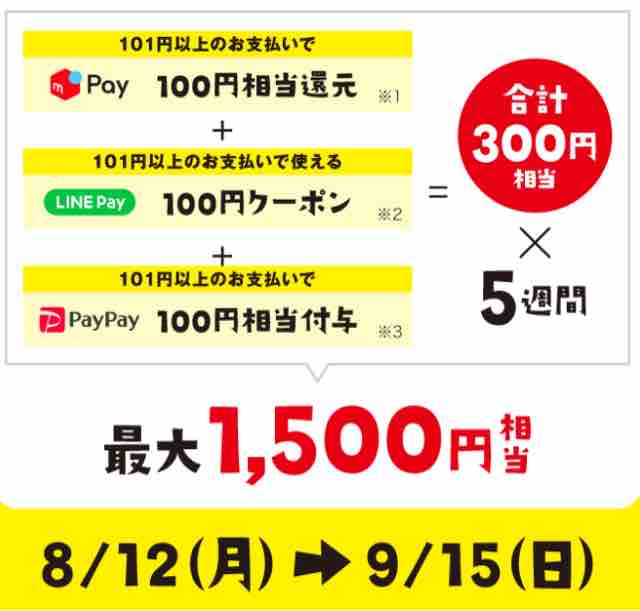 コンビニエンスストアのセブンイレブンで、「メルペイ」「LINE Pay」「PayPay」3社合同の決済で、5週間で最大1,500円相当お得に買い物できるキャンペーンが始まった。