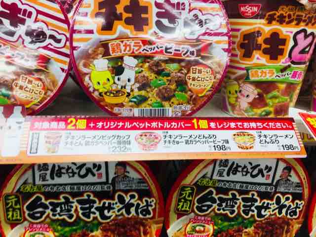 チキンラーメンオリジナルペットボトルカバーは、これまで類似のキャンペーンと同様にカップ麺売り場に置かれていた。対象商品はPOPで分かるように表示されており、対象商品2個とペットボトルカバー1個を持ってレジで会計すればもらうことができる。
