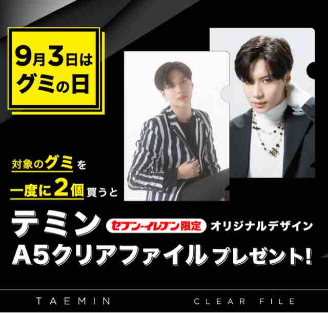 コンビニエンスストアのセブンイレブンで、対象のグミを一度に2個組み合わせ自由で購入すると、SHINeeテミンのA5クリアファイル全2種のうち、1枚がもらえるキャンペーンが始まっている。