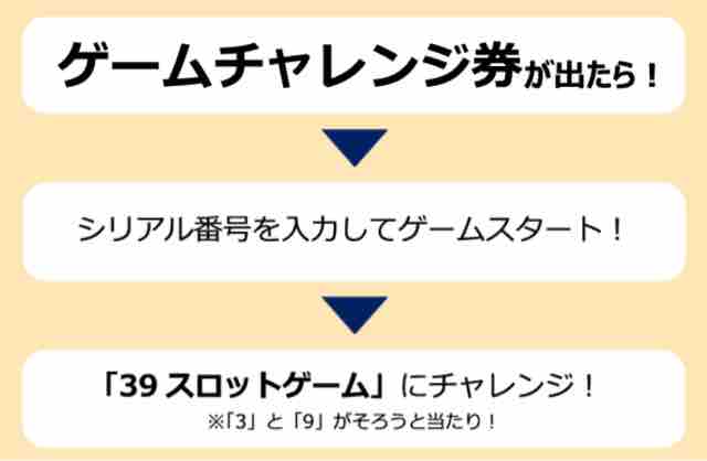 商品無料引換券が出なくてもゲームチャレンジ券がもらえる。ミニストップ公式ホームページのキャンペーンサイトから、ゲームチャレンジ券のシリアル番号を入力し、39スロットゲームにチャレンジ。3と9がそろうと当たりになり、ソフトクリームバニラの無料引換券が合計3,939名に当たる。ソフトクリームはコーン・カップが選べる。