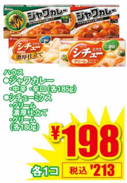 ハウスジャワカレー、シチューミクスが各税込213円。