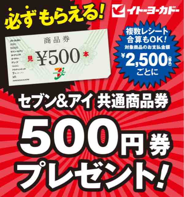 イトーヨーカドー指定の住まいの品・食料品などの商品を組み合わせ自由で、合計税込2,500円以上の買い物をすると、セブン&アイ共通商品券500円券が必ずもらえるお得なキャンペーンが実施されている。合計税込2,500円以上のレシートは、キャンペーン期間中の複数レシートを合算することができる。