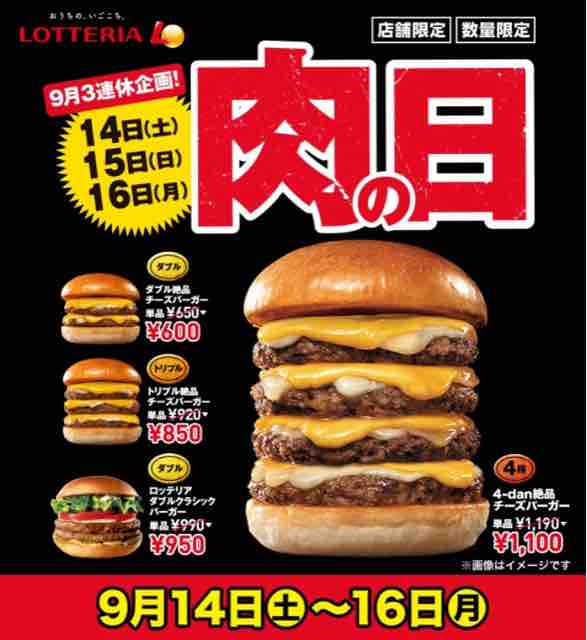 ハンバーガーチェーン店のロッテリアで、毎月27日~29日に実施している肉(ニク)の日を9月の3連休も実施し、ボリューム満点のハンバーガーをお得な価格で提供する。今回も前回に引き続き、4-dan絶品チーズバーガーを含めたボリュームバーガーが登場している。