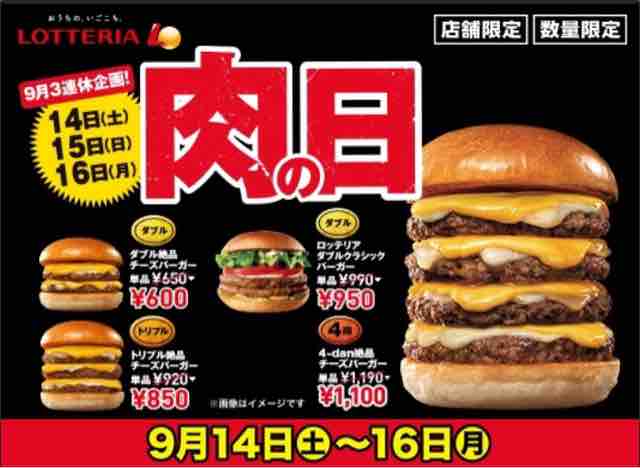 ・ロッテリアの2019年9月3連休肉の日は9月14日(土)~16日(月・祝)