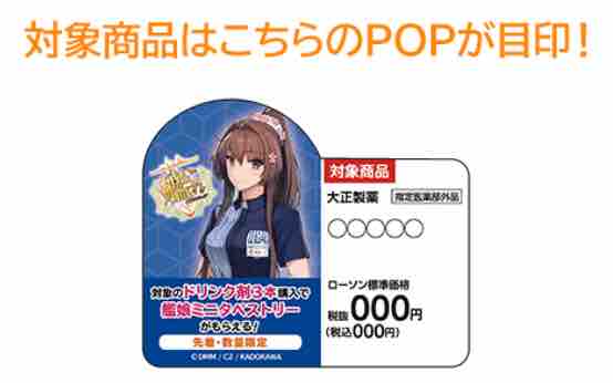 対象の大正製薬ドリンク剤を3本購入すると、先着・数量限定で艦これ運営鎮守府謹製ローソン限定の艦娘ミニタペストリー大和【制服mode】全1種のうち、1個をもらうことができる。艦娘がローソンの制服を着たミニタペストリー。各店計12個の用意となる。