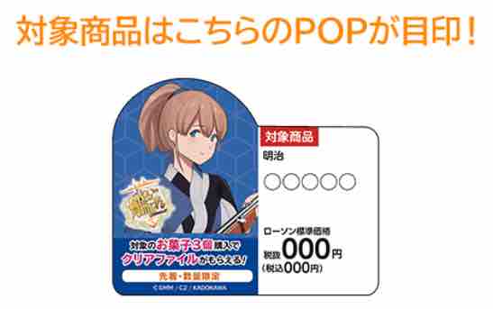艦娘の浴衣姿スタイルの可愛いクリアファイル。各店計30枚/1種10枚の用意となる。先ほどのオリジナルピンズよりは数が多く用意されているので、もらいやすそうだ。対象の明治お菓子はグミやチョコなどで、価格は100円程度から購入できる。対象商品はPOPを確認して欲しい。