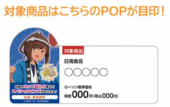 対象の日清食品カップ麺を2個購入すると、先着・数量限定で艦これ鎮守府謹製ローソン限定のスペシャルピンズこれくしょん全4種のうち、1個をもらうことができる。各店計12個の用意となるため、1種3個しか用意されていない。このオリジナルピンズはサイズ約40×40mm。