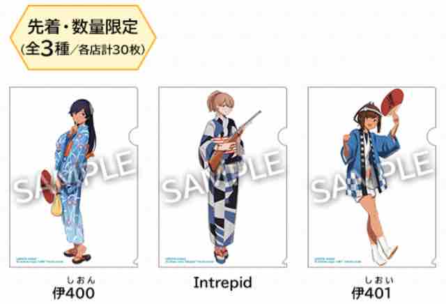 対象の明治お菓子を3個購入すると、先着・数量限定で艦これ運営鎮守府謹製ローソン限定の艦娘【浴衣mode】2019クリアファイル全3種のうち、1枚をもらうことができる。クリアファイルのサイズは公開されていない。クリアファイルは、伊400しおん、Intrepid、伊401しおいとなる。
