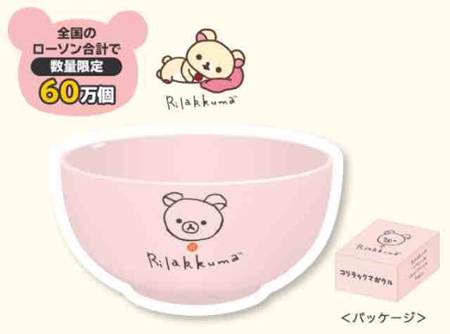 もらえるグッズは、スタンプ40個でリラックマボウルがもらえる。先着数量限定で全国のローソン合計で100万個の在庫が用意されている。材質は陶磁器で、サイズは直径14cm×高さ7cm。デザインはリラックマの顔が落書きのように描かれている。このデザインは好みが分かれそうだ。
