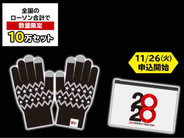 最後にスタンプ80個でもらえるグッズとして、LDH PERFECT YEAR 2020コラボグッズのスマホ手袋+スライダーポーチとなる。先着数量限定で全国のローソン合計で10万セットの在庫が用意されている。スマホ手袋はフリーサイズで約全長22cm×手囲い8cm、スライダーポーチは約縦17cm×横26cm×底マチ4cmとなる。11/26申込開始となる。