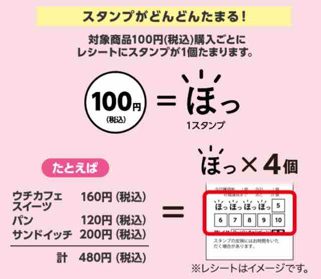 スタンプは対象商品税込100円購入ごとにレシートに1スタンプとしてリラックマの顔が印字される。Ponta会員・dポイントカード会員限定でカードを提示して対象商品を買うと、レシートに自動的にスタンプがたまっていく。欲しい景品のスタンプがたまったらLoppiで申し込み、景品受取期間に申し込みをして店舗で景品を受け取ることになる。