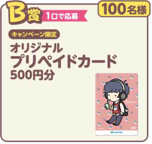 B賞は1口で応募することができ、景品はキャンペーン限定のそれらうのオリジナルプリペイドカード500円分(ファミリーマート専用のプリペイドカード)が100名に当たる。