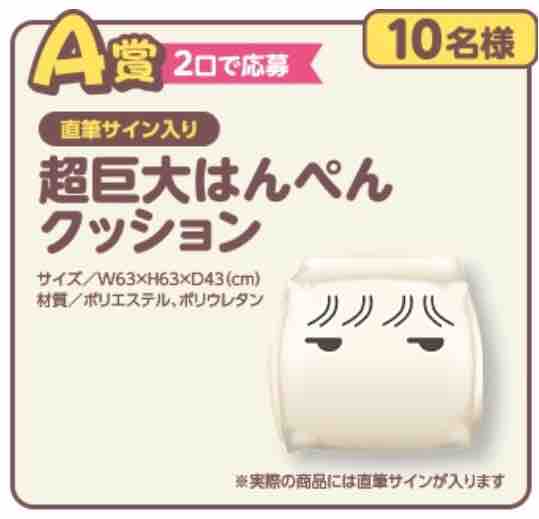 A賞は2口で応募することができ、景品は直筆サイン入りの超巨大はんぺんクッションが10名に当たる。サイズはW63×H63×D43cm。材質はポリエステル、ポリウレタンとなる。