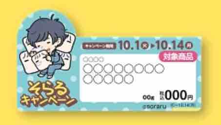そらるのキャンペーンは、対象商品を買ってもらえるオリジナル缶バッジの他、景品が抽選で当たるレシート応募も実施される。対象商品を1品以上を含む500円(税込)以上のレシートを撮影し、キャンペーンサイトから応募することで、抽選に応募することができる。
