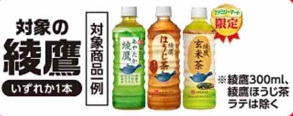 コンビニエンスストアのファミリーマートで、対象の綾鷹いずれか1本と麺類各種を同時に買うと、綾鷹玄米茶1本の無料引換券クーポンがもらえるキャンペーンが始まっている。