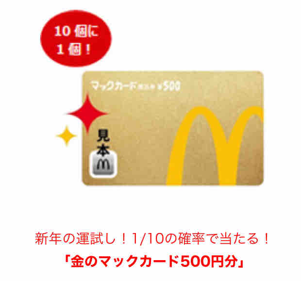 福袋10個に1個入っている金のマックカード500円分は、新年の運試しに楽しみながら中身を確認できる。このカードは、カードが金色なだけで金属製ではないとの注意書きがある。