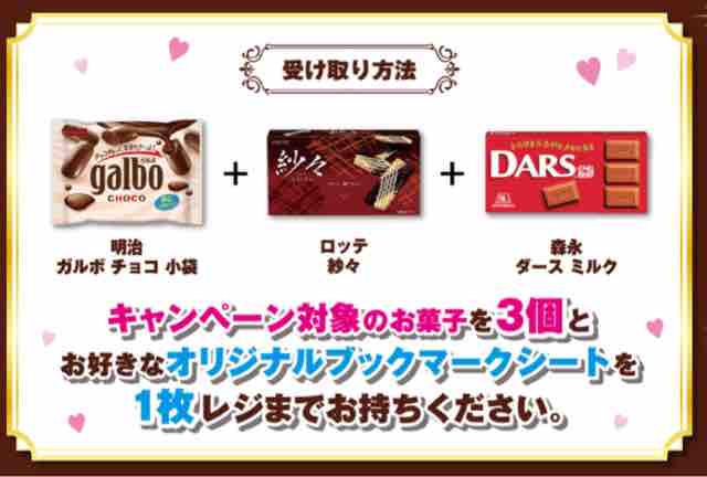 キングオブプリズムのブックマーク受け取り方法の案内には、キャンペーン対象商品の明治ガルボチョコ小袋+ロッテ紗々+森永ダースミルクのお菓子3個とオリジナルブックマークシートを1枚レジまでお持ちくださいと書かれている。今回は決められた対象商品を全てセットで買ってグッズがもらえるキャンペーンのようだ。