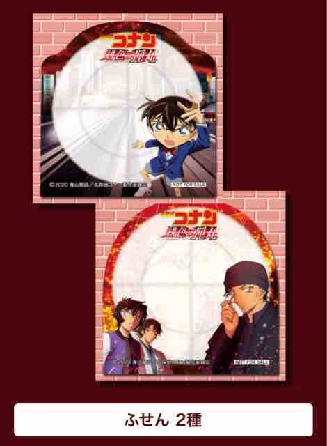 名探偵コナンオリジナルグッズは、映画「名探偵コナン緋色の弾丸」にちなんだグッズもあり、チケットファイルが2種、ノートが2種、ふせんが2種、ステッカーが2種の全8種だ。合計24個の景品で、先着数量限定。様々なデザインの種類豊富なグッズがもらえる豪華なキャンペーンだ。