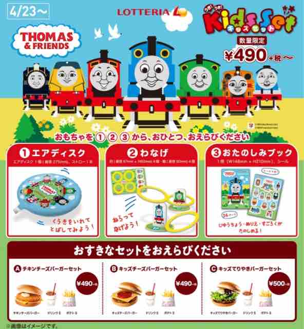 ロッテリアのキッズセットおもちゃに、きかんしゃトーマスのエアディスク、わなげ、おたのしみブックが登場している。無くなり次第終了となるが、約3ヶ月の期間この企画は実施されており、結構長く登場する。