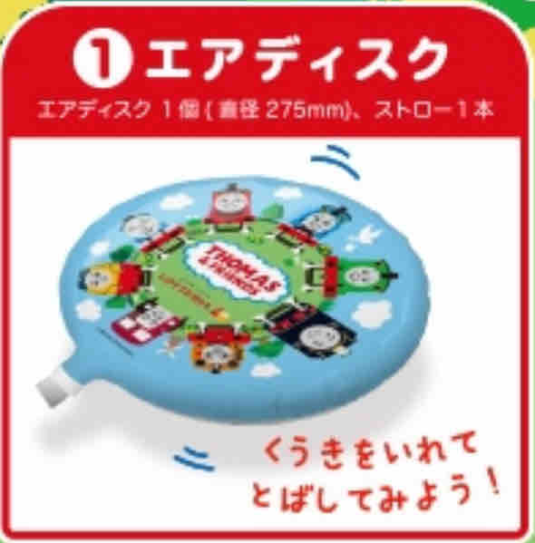 きかんしゃトーマスのおもちゃは、エアディスク、わなげ、おたのしみブックの3種が登場。好きなおもちゃを選ぶことができる。エアディスクは、空気を入れてふくらませ、広いところで飛ばして遊ぶことができる。たくさんのキャラクターが描かれたデザインのおもちゃとなる。