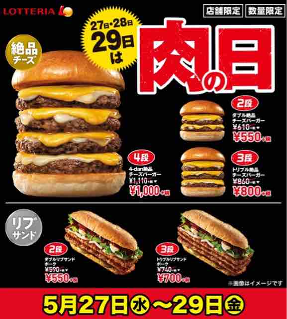 今回はロッテリア5月27日~29日に実施される肉の日キャンペーンを紹介していきたい。