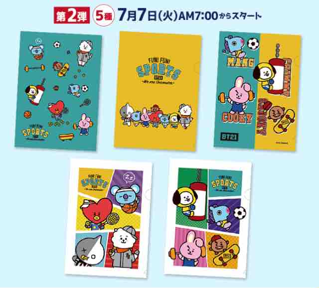 コンビニエンスストアのファミリーマートで、BT21キャンペーンが始まった。キャンペーンは対象商品3個を買うとキャンペーン限定オリジナルA5サイズクリアファイル全10種のうち、1枚がもらえ、更に対象商品を含む500円(税込)以上のレシート応募で、ファミリーマート限定のBT21オリジナルプリペイドカード500円分の賞品が抽選で当たる。