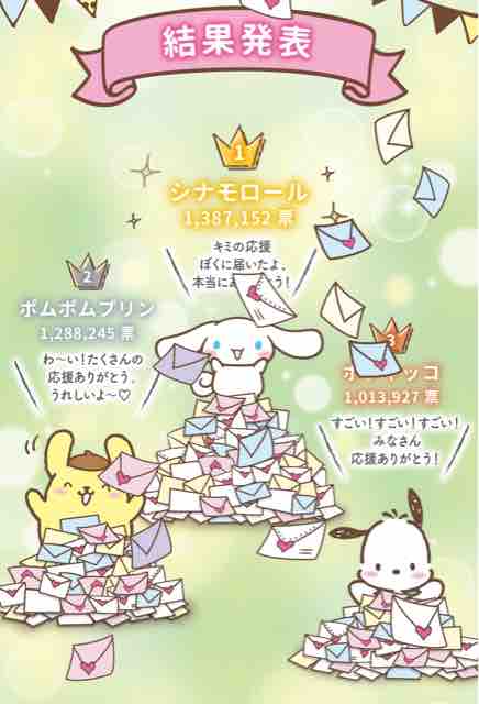 今回、サンリオキャラクターズのスライダーポーチがもらえるキャンペーンを紹介したが、サンリオキャラクターズといえば気になるのが、毎年恒例の2020サンリオキャラクターの総合順位の結果だ。2020サンリオキャラクター大賞の総合順位は以下の通り。