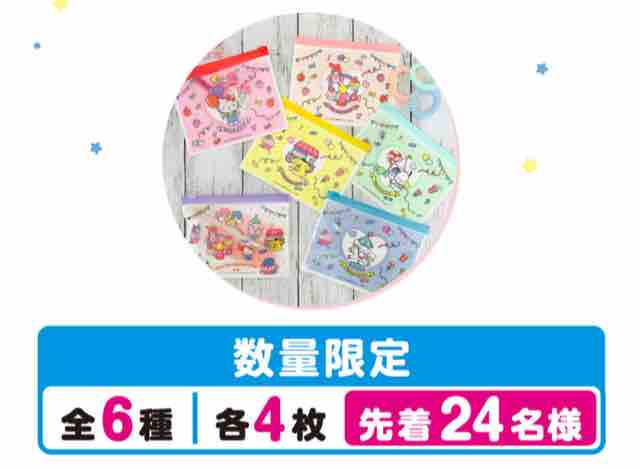対象商品の栄養ドリンクを2本購入ですると、先着・数量限定でもらえるサンリオキャラクターズのスライダーポーチ全6種のうち、1枚がもらえる。各4枚で合計24枚がセブンイレブン各店舗で用意されている。サンリオキャラクターズの可愛いイラストが描かれたポケットファイルは人気がありそうだ。