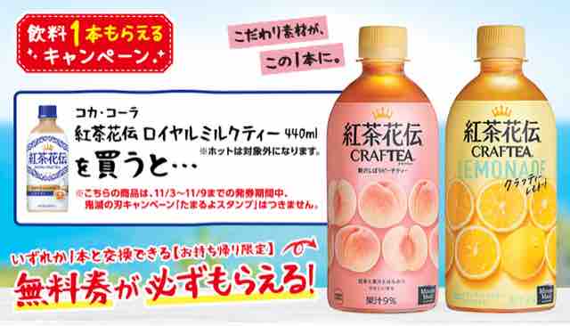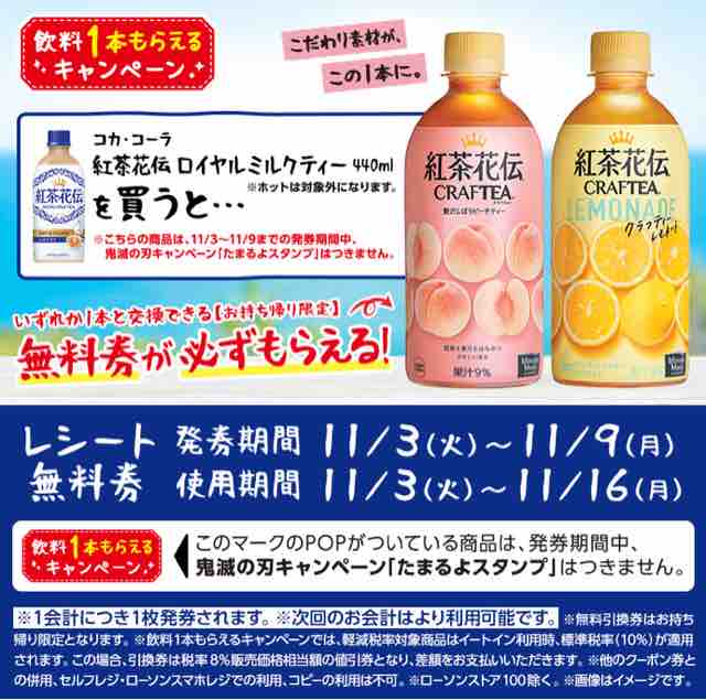 コンビニエンスストアのローソンで、対象の紅茶花伝ロイヤルミルクティー440mlを1本買うと、クラフティーピーチティーもしくはクラフティーレモネード440mlの無料引換券が、レシートクーポンで必ずもらえるキャンペーンが始まっている。