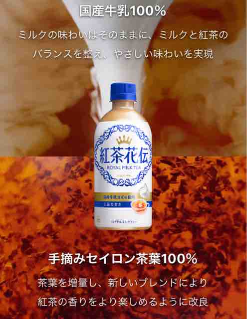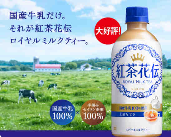 無料引換券がもらえる対象の飲料は紅茶花伝ロイヤルミルクティー440ml。しっかりとした紅茶本来の味わいが楽しめる、大人のための上質で本格的な紅茶。「紅茶花伝」という名前は、有名な能の書物である風姿花伝をもじって作られたもので、上品で高貴なイメージを表している。