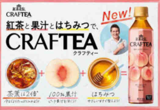 クラフティーピーチティーは、 茶葉2倍の香り豊かな紅茶に、おいしいところを絞った果汁を9%使用(紅茶花伝 ロイヤルレモンティー比)。 仕上げにはちみつを加えた、やさしい甘さとすっきりとした味わいが楽しめるピーチティー。