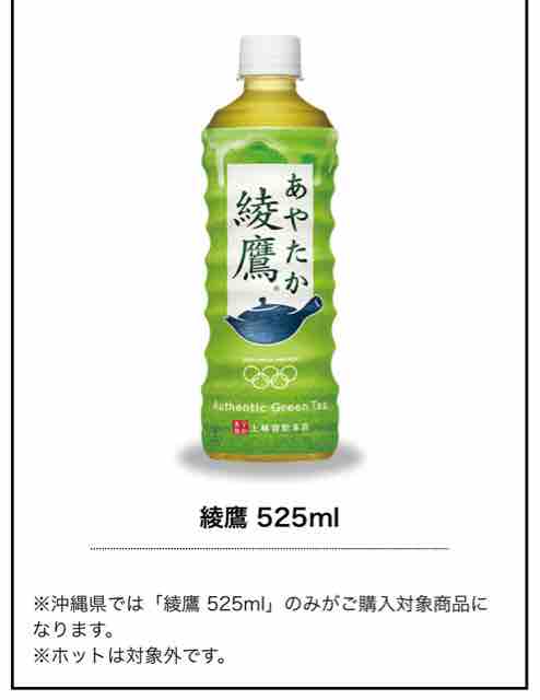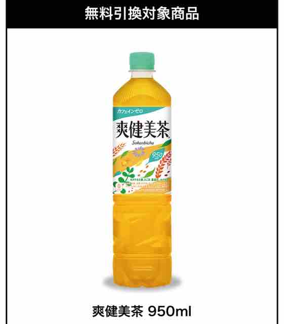 無料引換券がもらえる購入対象商品は、「爽健美茶 600ml」または「綾鷹 525ml」で1本買うと無料引換券がもらえる。もらえる無料引換券の対象商品は「爽健美茶 950ml」または「綾鷹 950ml」。