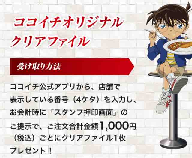全国のココイチ(カレーハウスCoCo壱番屋)で、注文金額1,000円以上(税込)ごとの会計で、スマホのココイチ公式アプリの「スタンプ押印画面」を提示すると、名探偵コナン人気キャラクターたちの描き下ろしA4クリアファイル全8種のうち、1枚をその場でもらうことができる。