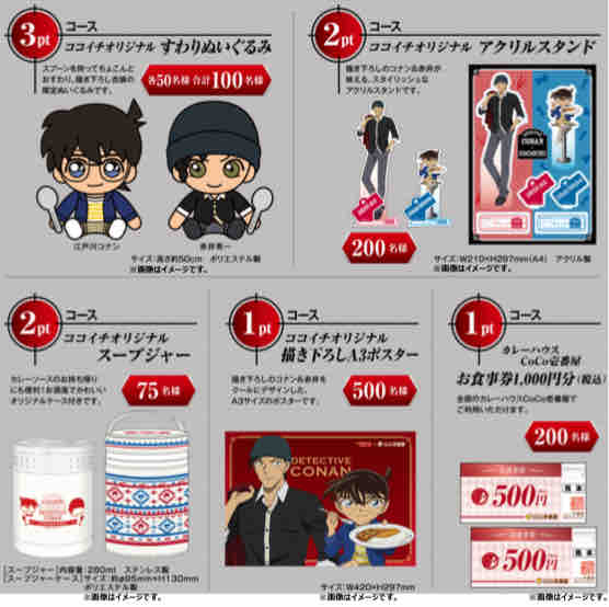 抽選で当たる賞品は、3ptコースがココイチオリジナルすわりぬいぐるみで、江戸川コナン、赤井秀一で各50名、合計100名に当たる。