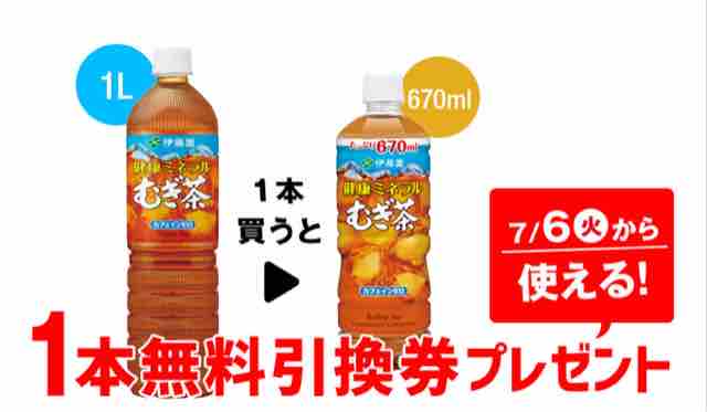 ・伊藤園健康ミネラルむぎ茶670mlの無料引換券がもらえる