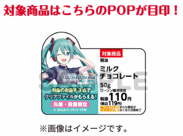 コンビニエンスストアのローソンで、対象の明治お菓子各種を3点買うと先着で「プロジェクトセカイカラフルステージfeat.初音ミク」のオリジナルクリアファイル全6種がもらえるるキャンペーンが始まる。