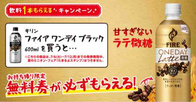 この対象のキリン ファイア ワンデイ ブラック 600mlを買うと、キリン ファイア ワンデイ ラテ微糖 600mlと交換できる無料引換券がレシートクーポンとして発行される。無料引換券は発行されたコンビニチェーン以外では利用できない。つまりセブンやファミマでは利用できないので注意しよう。