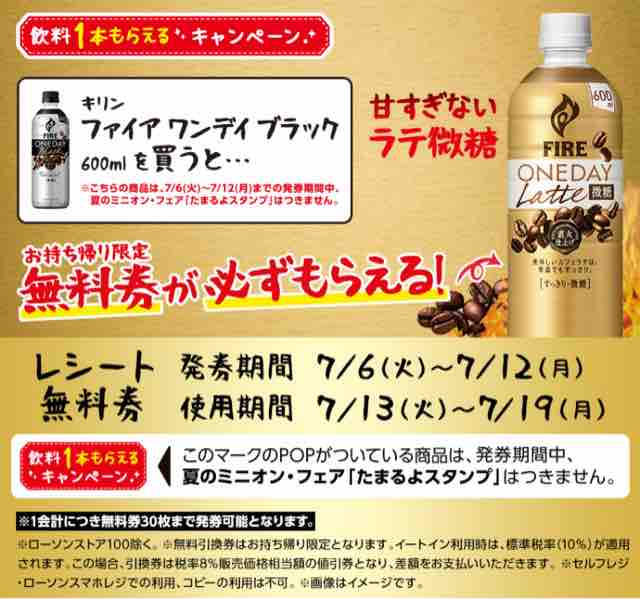 ・ローソンで「キリン ファイア ワンデイラテ微糖」の無料引換券がもらえる