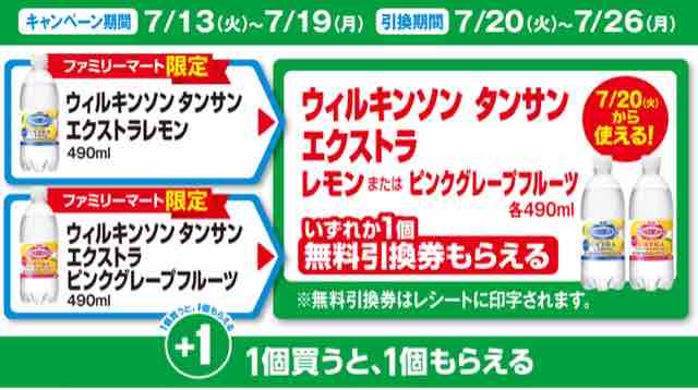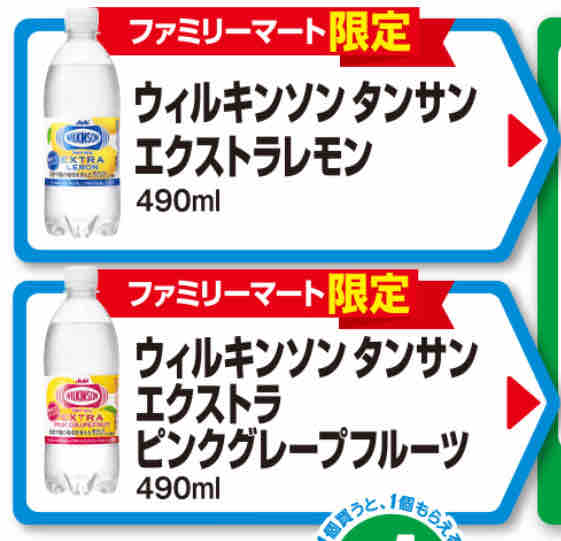 このウイルキンソン タンサン エクストラ レモン または ピンクグレープフルーツ 各490mlを買うと、同商品と交換できる無料引換券がレシートクーポンとして発行される。無料引換券は発行されたコンビニチェーン以外では利用できない。つまりセブンやローソンでは