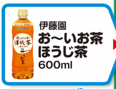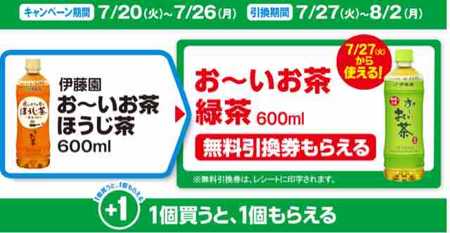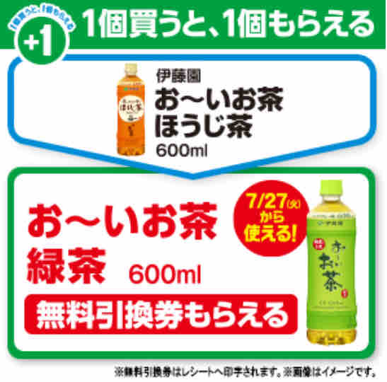 コンビニエンスストアのファミリーマートで対象の伊藤園お~いお茶ほうじ茶600mlを1本買うと、伊藤園お~いお茶緑茶600mlの無料引換券が、レシートクーポンで必ずもらえるキャンペーンが始まっている。