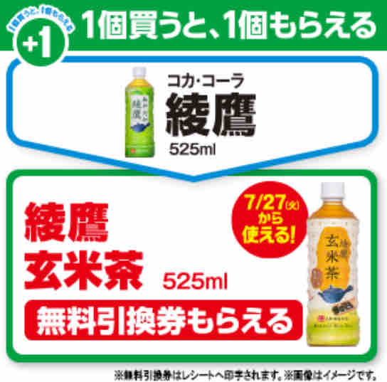 コンビニエンスストアのファミリーマートで、対象の飲料を買うと、同メーカーのペットボトル飲料の無料引換券がもらえるキャンペーンが始まっている。無料引換券がもらえる購入対象商品は、コカ・コーラ綾鷹525ml。無料引換券の対象商品は、コカ・コーラ綾鷹玄米茶525mlとなる。