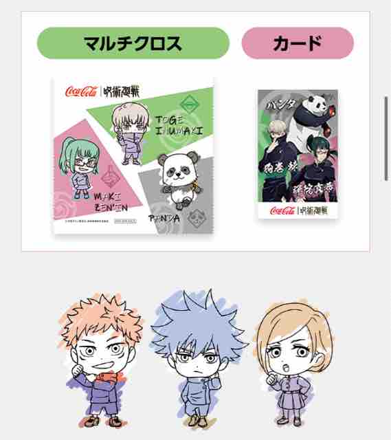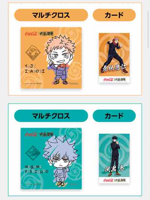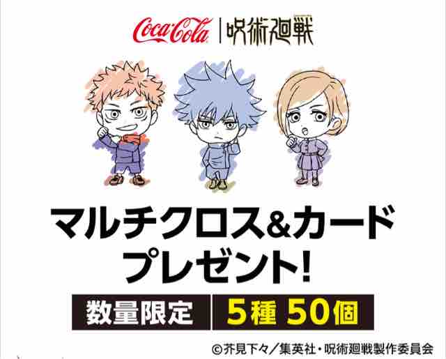 セブンイレブンで、対象のソフトドリンクを組み合わせ自由で2本同時に買うと、呪術廻戦のオリジナルマルチクロス&カード全5種のうち、その場で好きな1つがもらえる。このキャンペーンでしか手に入らないオリジナルデザインとなる。