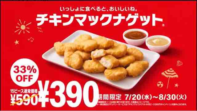 今回はマクドナルドのチキンマックナゲット15ピース(ソース3個付き)を特別価格税込390円の33%OFFで販売するキャンペーンを紹介した。気になる方はマクドナルドへ行ってみてはいかがでしょうか。