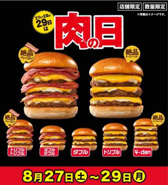 今回はロッテリアで8月27日~29日に実施される肉の日キャンペーンを紹介していきたい。