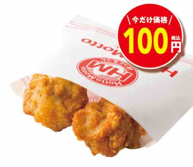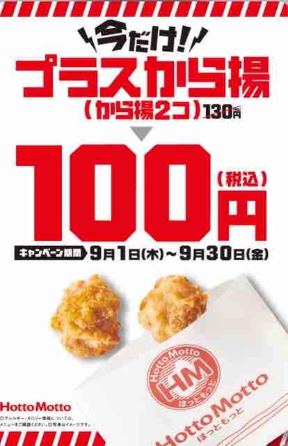 持ち帰り弁当チェーン店のほっともっとで、人気のから揚をお得にプラスできるプラスから揚(から揚2コ)が130円のところ100円(税込)で購入できるキャンペーンが始まった。