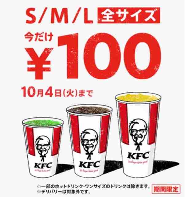 フライドチキンが主力商品のケンタッキーフライドチキンで、ドリンクのS・M・L全サイズが今だけ期間限定で100円(税込)になるキャンペーンが始まった。