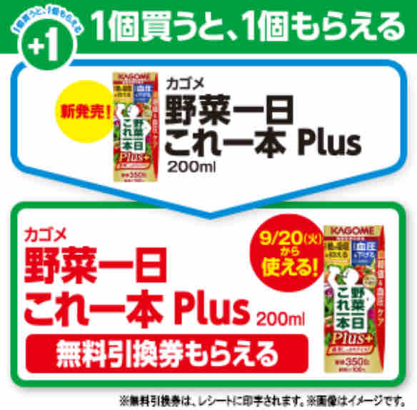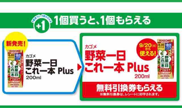ファミリーマートで「カゴメ野菜一日これ一本Plus200ml」を1本買うと、同商品の無料引換券が必ずもらえるキャンペーンが始まっている。