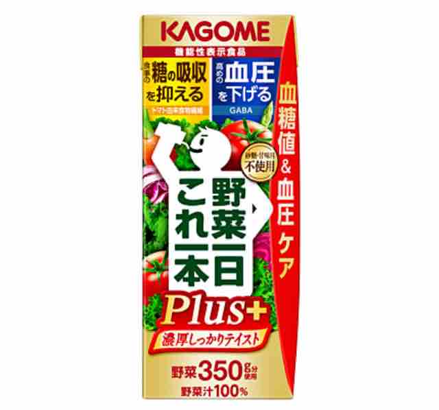 カゴメ野菜一日これ一本Plusは機能性表示食品。トマト由来食物繊維とGABAが含まれている。トマト由来食物繊維には糖の吸収を抑制し食後血糖値の上昇を抑える機能がある。GABAには高めの血圧を下げる機能があることが報告されている。