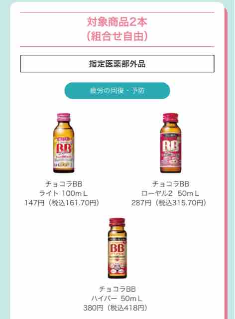 2本組み合わせて買うと、プレゼントがもらえるキャンペーン対象商品の栄養ドリンクは以下の通り。栄養ドリンク各種