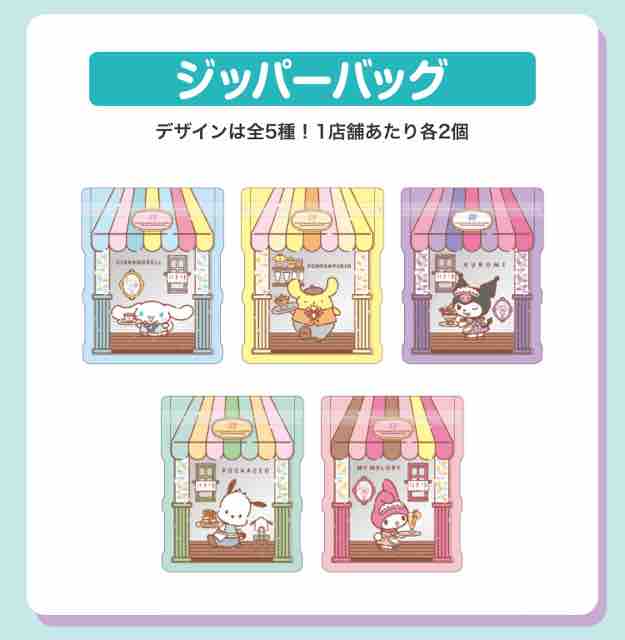 グッズは、サンリオのキャラクターがたくさん描かれている。ジッパーバッグは全5種で1店舗あたり各2個用意されている。